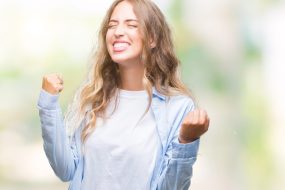 Beautiful young blonde woman over isolated background very happy and excited doing winner gesture with arms raised, smiling and screaming for success. Celebration concept.